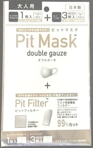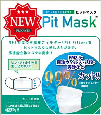 品 名ピットマスクダブルガーゼ/ピットフィルター子供用 サイズマスク:10.5×20cmフィルター:6.5×11.5cm 入 数マスク1枚+フィルター3枚 材 質マスク/ガーゼフィルター/ポリプロピレン・メルトブローン不織布 ※PFE(0.1μm)99%カットのフィルター 微小粒子捕集(ろ過)効率(PFE)試験済みN95対応の高機能フィルターを差し込むだけで、 飛沫ウィルス・PM2.5・花粉・黄砂などを99%カット! N95対応の高機能フィルター「ピットフィルター」を差し込み交換できる、ポケット付き立体ガーゼマスクです。